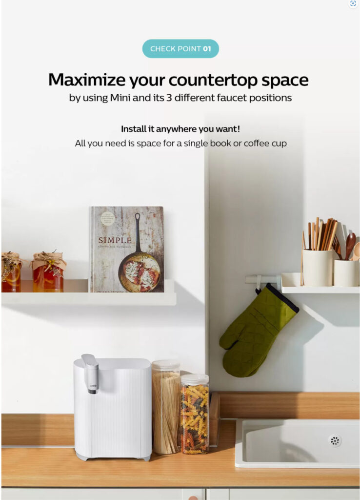 Maximise your countertop space by using Mini and its 3 different faucet positions